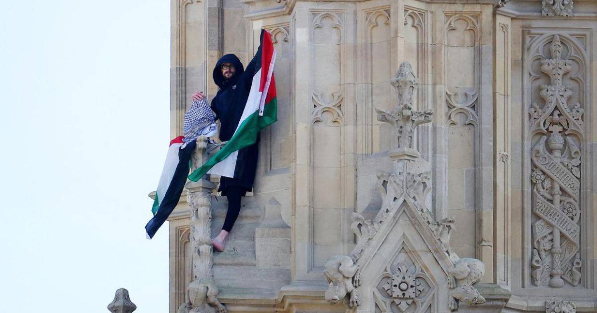 Londres, Inglaterra.- Los servicios de emergencia británicos han acordonado una zona que rodea el Big Ben en Londres después de que un hombre con una bandera palestina consiguiera escalar una parte de la torre Elizabeth que alberga el famoso reloj, que está en el palacio de Westminster, sede del Parlamento del Reino Unido.