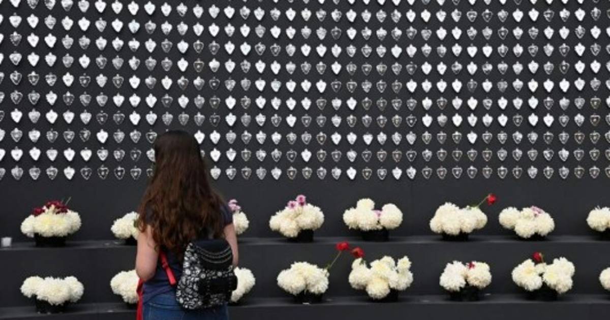 El colorido y bullicio que caracterizan al lugar se transforma por la presencia de un gran panel de color negro con una leyenda en letras gris claro que dice: 'En memoria de los que se han ido pero perduran en nuestro corazón'.
