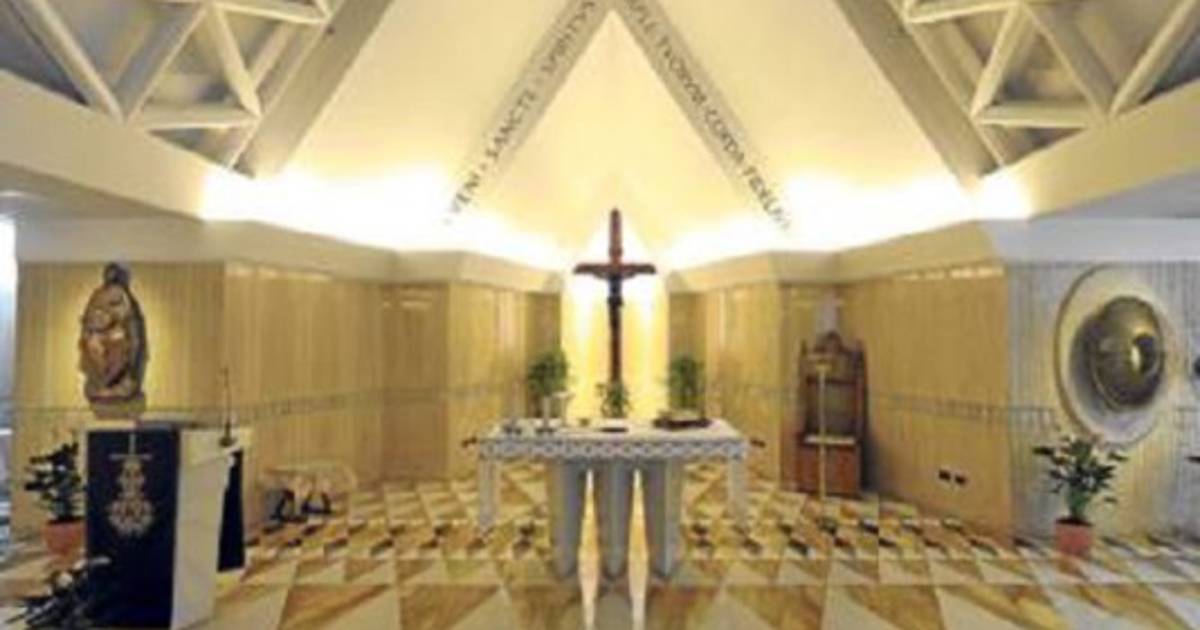 El hotel de los cardenales tiene también una pequeña capilla, un amplio comedor con mesas redondas dispuestas sobre un suelo de mármol de color claro.