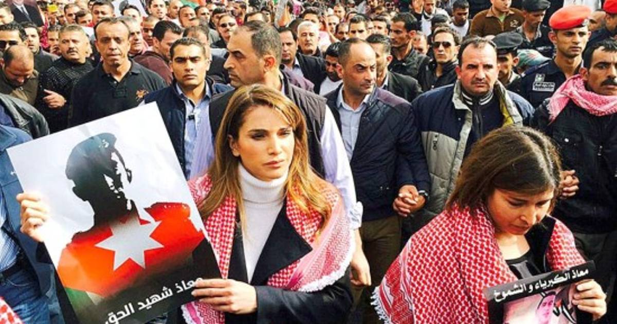 La reina Rania de Jordania se unió este viernes a las miles de personas que marcharon por las calles de Ammán para condenar la ejecución del piloto Maaz al Kasasbeh por el grupo yihadista Estado Islámico (EI).