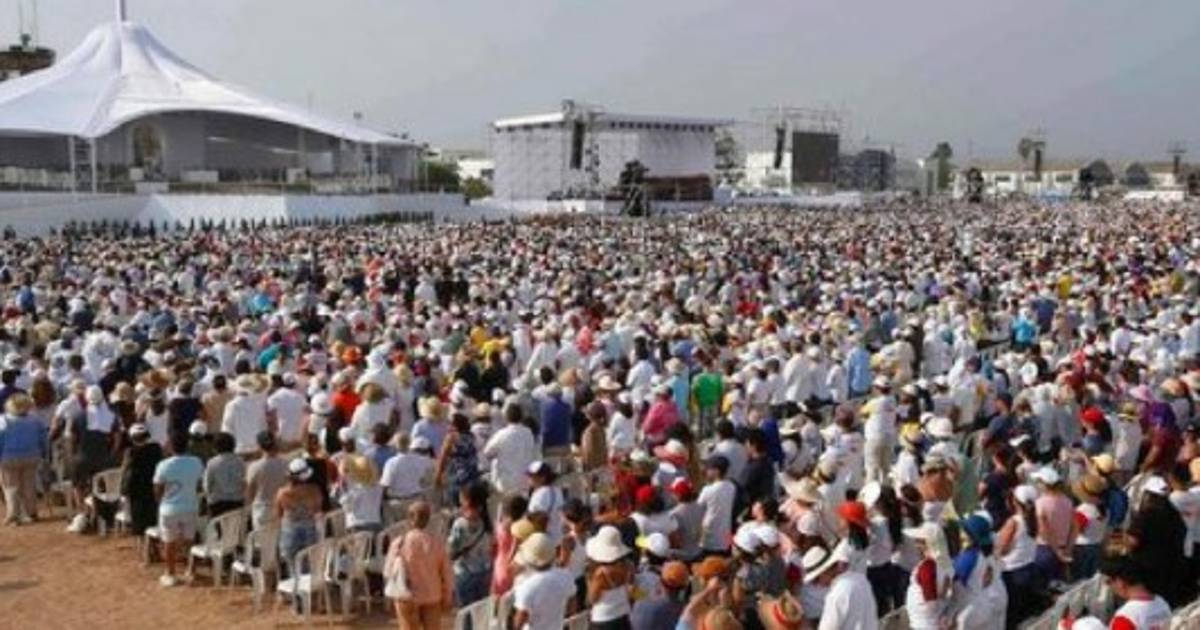 En la gran base aérea los bomberos arrojaron agua a grandes multitudes reunidas bajo un potente sol que ondeaban banderas del Vaticano y de Perú.
