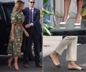 Además, la esposa de Donald Trump optó por unos zapatos de punta del mismo tono que el jumpsuit; su atuendo lo completó con un cinturón 'mini metalizado', elección que los críticos han catalogado como atinada.