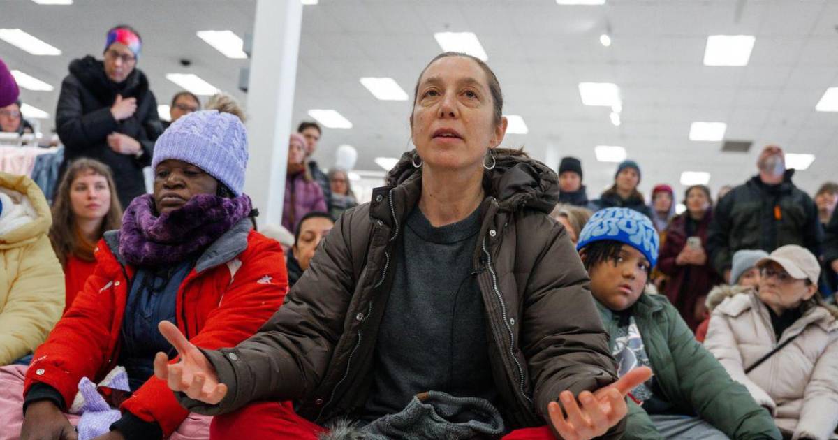 Minneapolis, Estados Unidos.— Miembros de la comunidad migrante y residentes de Minneapolis realizan una sentada este martes 20 de enero frente a una tienda Target de la ciudad, como protesta por la aplicación de las leyes migratorias federales.