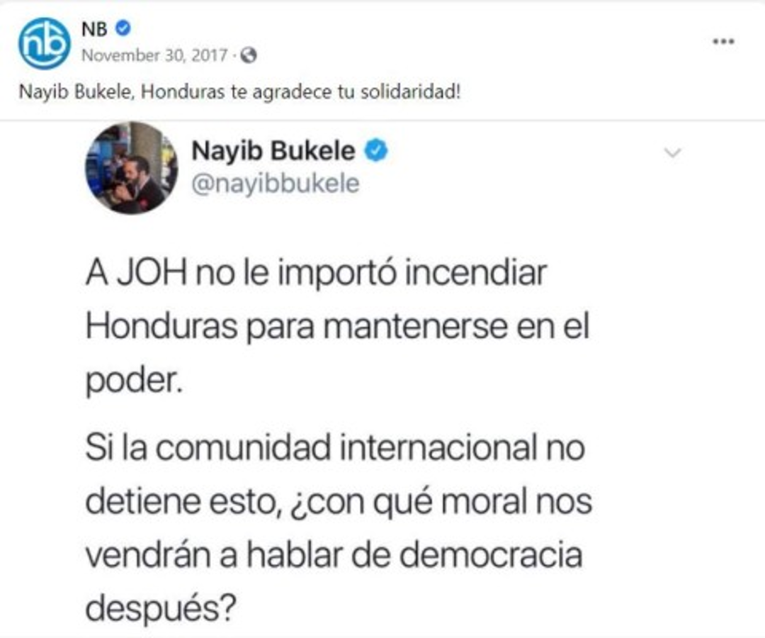 El mensaje de Bukele decía: 'A JOH no le importó incendiar Honduras para mantenerse en el poder. Si la comunidad internacional no detiene esto, ¿con qué moral nos vendrán a hablar de democracia después?'.