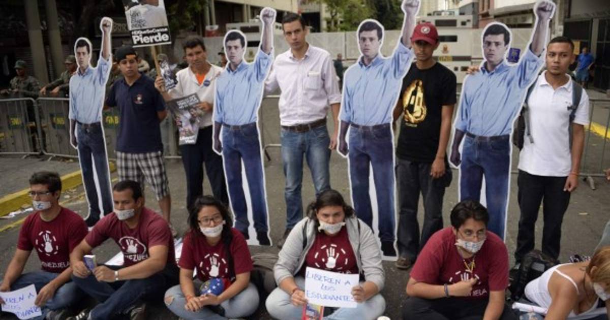 Supporters of arrested opposition leader Leopoldo Lopez demonstrate in front of the Venezuelan courthouse in Caracas on July 23, 2014. The trial of 43-year-old Lopez, a Harvard-educated economist accused of inciting violence in recent anti-government protests that have left dozens dead, begins on Wednesday. Lopez is charged specifically with instigating arson and property damage and with criminal association and if convicted coukld face up to 10 years in prison. AFP PHOTO/Leo RAMIREZ