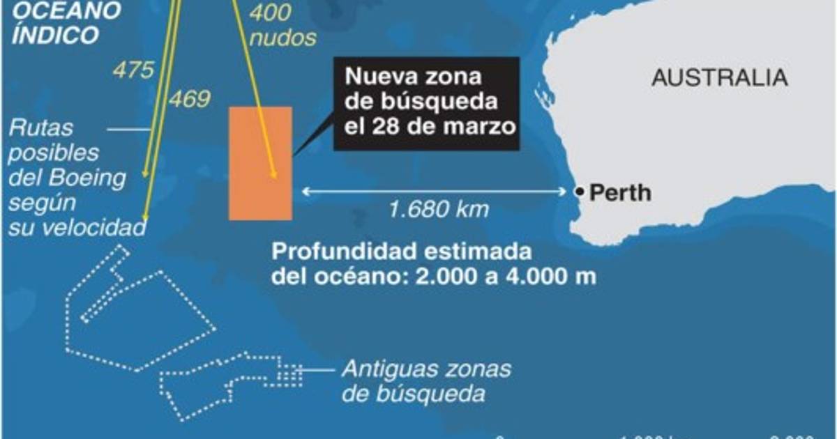 La nueva zona de búsqueda tiene una superficie de aproximadamente unos 319.000 kilómetros cuadrados y se encuentra a 1.850 kilometros al oeste de Perth, la gran ciudad del occidente de Australia.