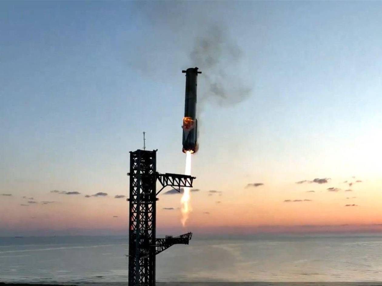 San Antonio, Estados Unidos.- SpaceX completó su quinta prueba del Starship, el mayor cohete espacial jamás construido, con éxito y en su primer intento consiguió recuperar la primera fase de la nave con una grúa en la misma plataforma de lanzamiento, un hito de la ingeniería espacial.