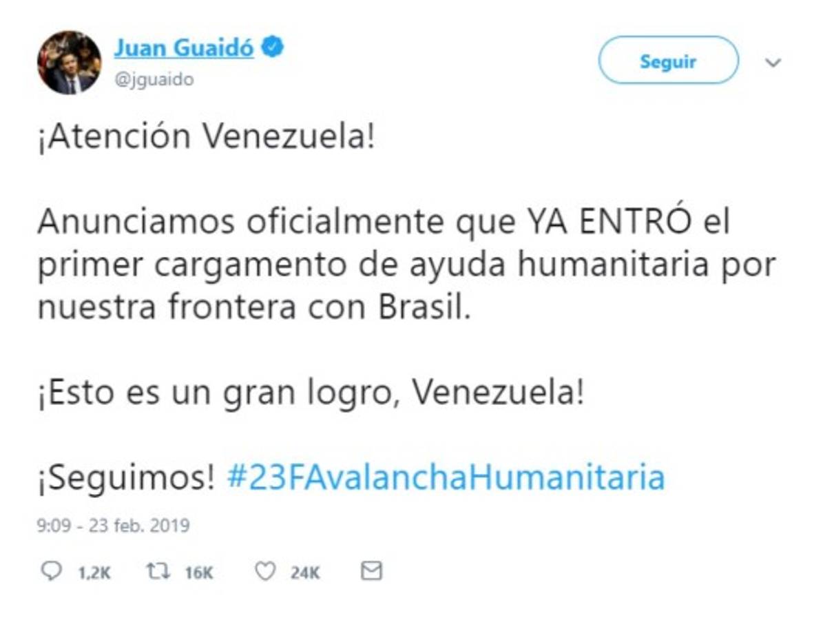 En la frontera de Colombia y Brasil también se encuentran camiones con ayuda humanitaria y Guaidó afirmó en un tuit que 'YA ENTRÓ el primer cargamento de ayuda humanitaria'.