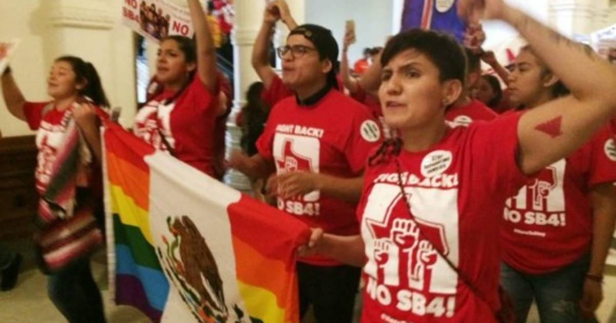Los manifestantes vestidos con camisetas rojas con la palabra “Lucha” ocuparon en silencio varios asientos de la galería mientras iniciaban los procedimientos. Después de unos 40 minutos, comenzaron a aplaudir, acallando a los legisladores que se encontraban en el piso inferior. También sonaron silbatos y gritaron: “¡Aquí para quedarnos!” y “Hey, hey, ho, ho, la SB4 debe irse”, refiriéndose a la ley que promulgó el gobernador Greg Abbott este mes.