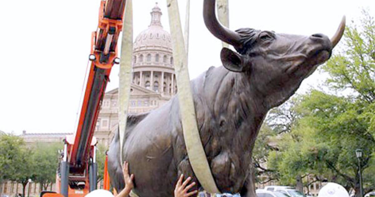 Estatuas de bronce montadas en una placa de granito de 250 toneladas representan a un explorador español, a un vaquero montando su caballo, a un toro de cuernos largos, a una vaca y a una familia de colonizadores.