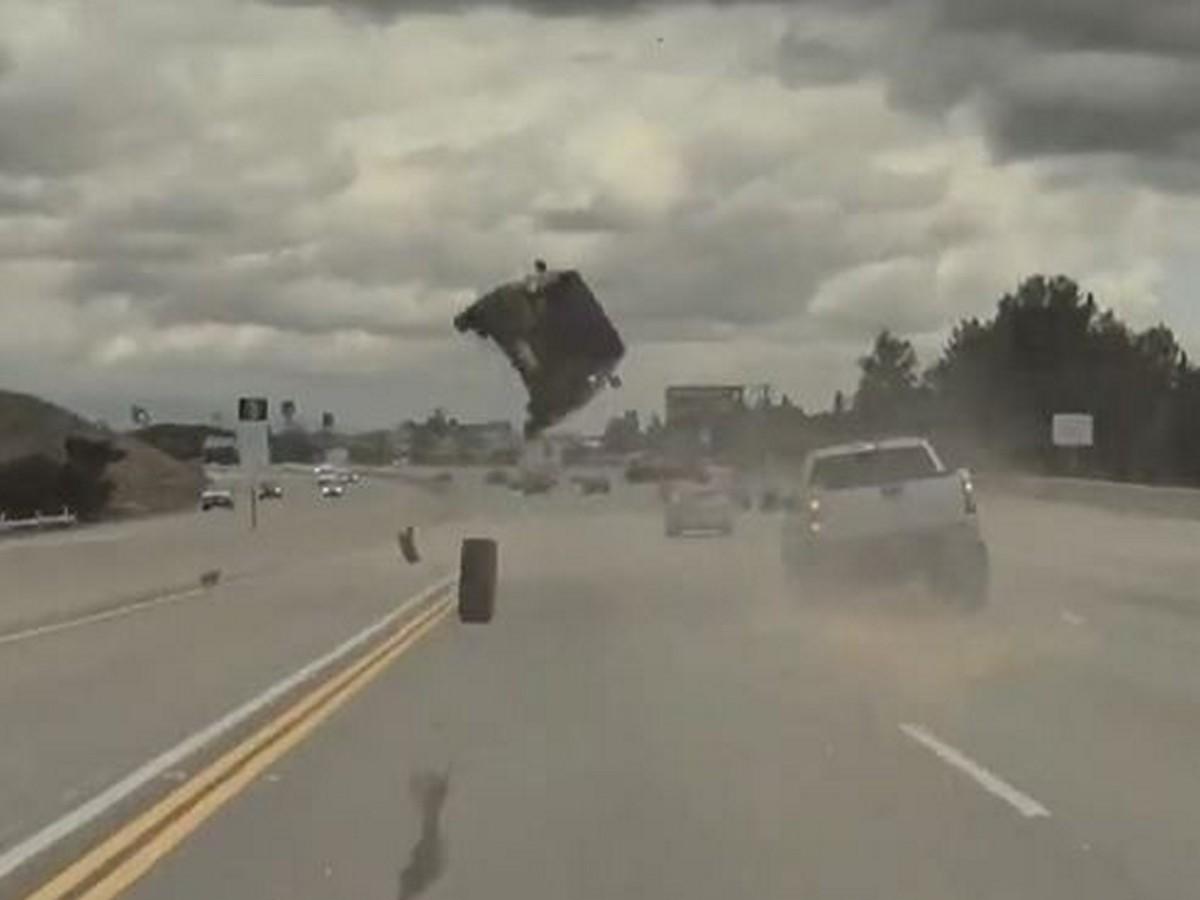 LOS ÁNGELES, ESTADOS UNIDOS.- Un aparatoso accidente ocurrió en la autopista en Twin Lakes, al norte de Los Ángeles, California, cuando un neumático se desprendió de un auto a alta velocidad y provocó que otro vehículo volcara.