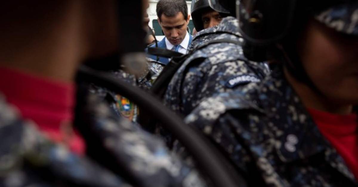 Guaidó, que exhibía signos de golpes y vestía un traje azul con pedazos desgarrados, incluso trató de ingresar trepando a las rejas del ala sur del Palacio Legislativo, pero guardias nacionales con la ayuda de escudos plásticos le bloquearon el paso.