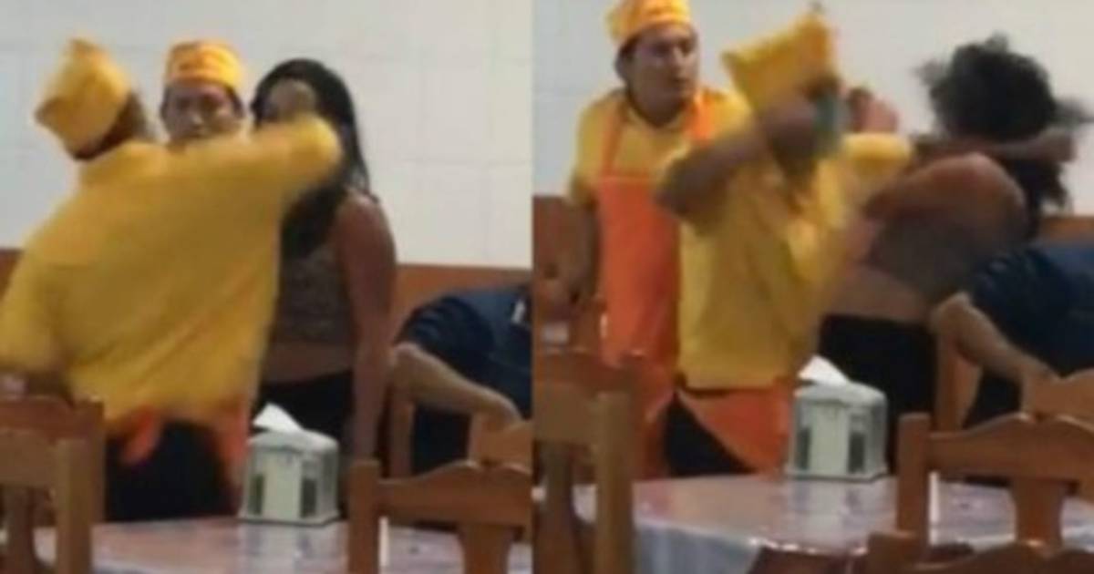 Las imágenes que fueron captadas dentro del restaurante, muestran a tres empleados forcejeando.