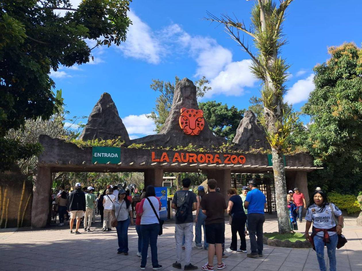 Su entrada es imponente. Aparece el rostro de un jaguar plasmado en metal y en la parte inferior el nombre del reciento: Zoológico La Aurora. Está ubicado en Ciudad de Guatemala, Guatemala.
