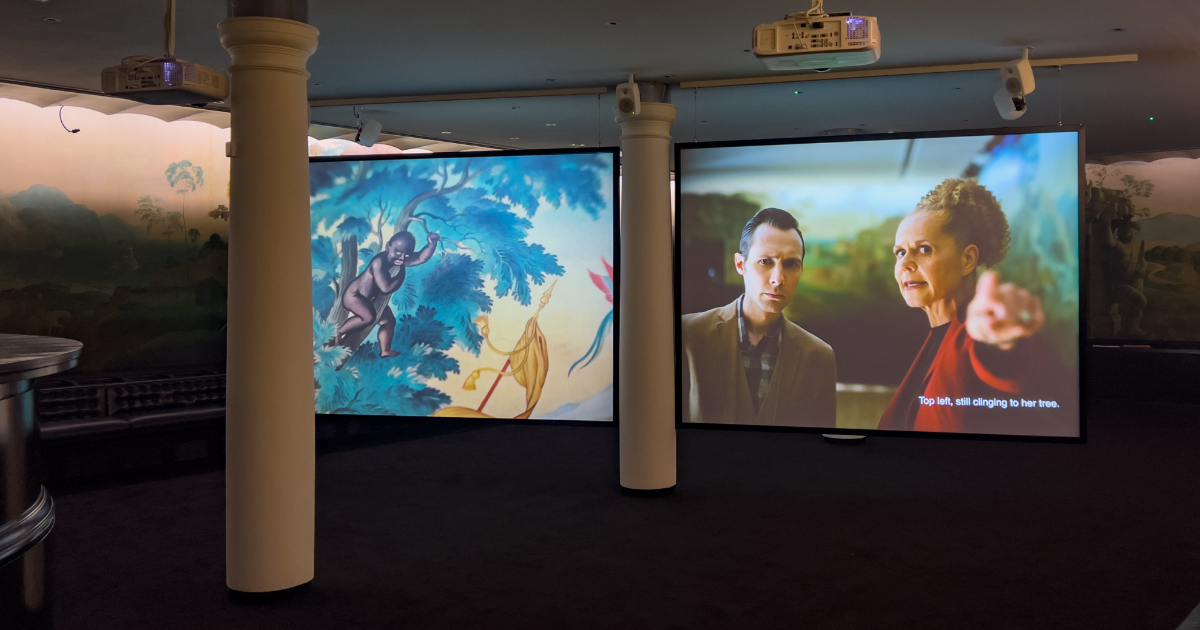 Titulada “Viva Voce”, el nombre en latín de los exámenes orales universitarios en Gran Bretaña, la película de 22 minutos en dos pantallas de Piper dramatiza una conversación imaginaria entre Whistler (interpretado por Ian Pink) y una catedrática universitaria (Ellen O’ Grady). En la primera mitad de la película, la catedrática pregunta a Whistler sobre la historia del mural, que el artista completó en 1927.