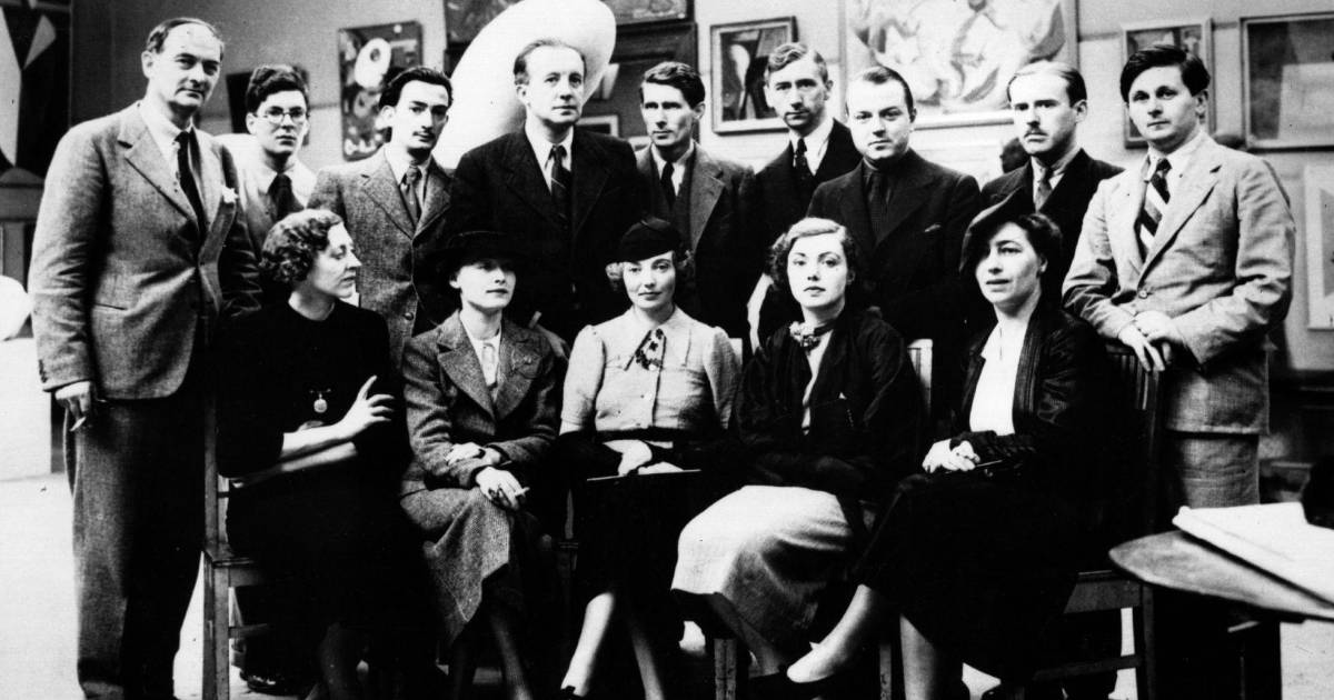 Artistas en una exposición de surrealismo en Londres, en la década de 1930, entre ellos Salvador Dalí (tercero izq., segunda fila) y Paul Éluard (a su izq.).