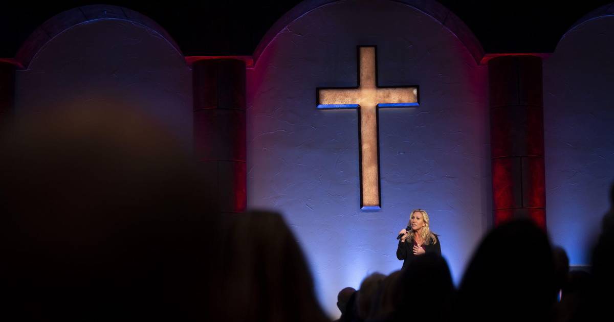 La diputada Marjorie Taylor Greene se considera una “nacionalista cristiana”. Un mitin en una iglesia en Texas.
