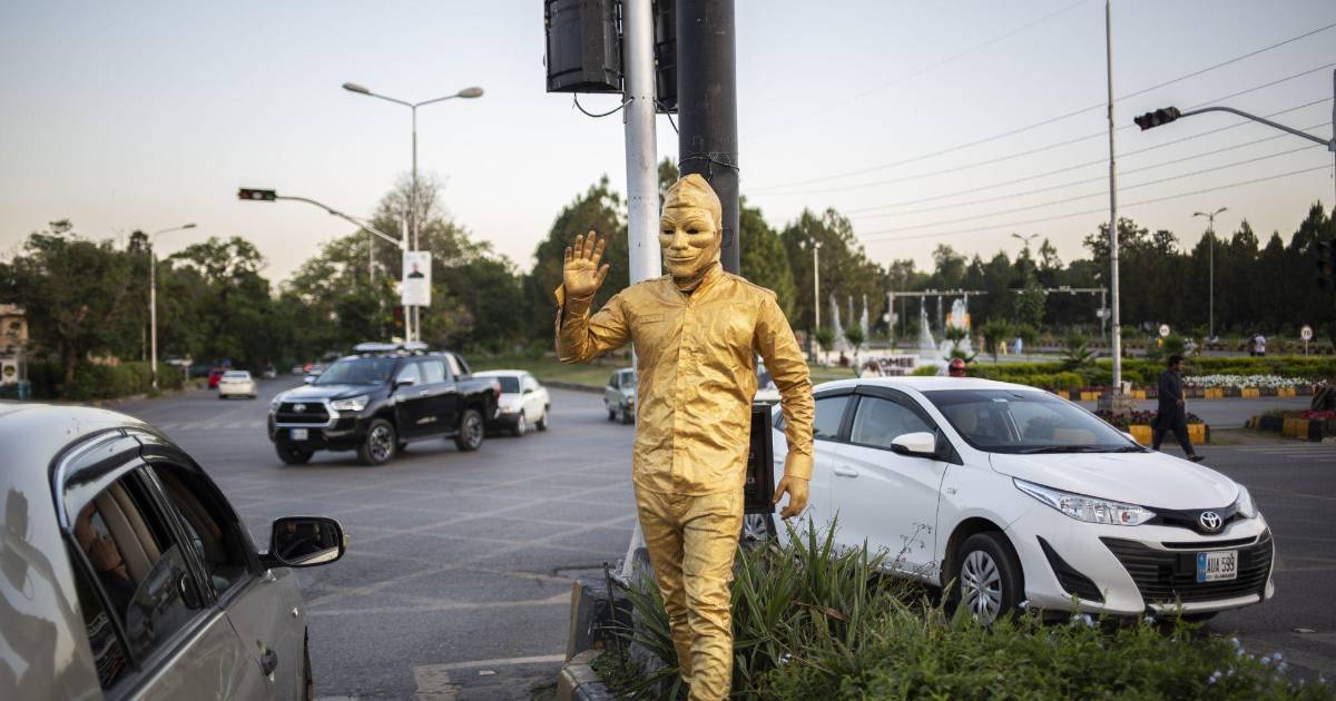 ISLAMABAD, Pakistán — Los artistas callejeros aparecieron por primera vez hace unos años en las concurridas intersecciones de Islamabad. Cubiertos de pies a cabeza en pintura dorada, permanecían perfectamente quietos, apoyados en bastones relucientes y abriendo sus sombreros de copa. Algunos esbozaban una sonrisa o asentían lentamente al recibir propinas de los transeúntes.