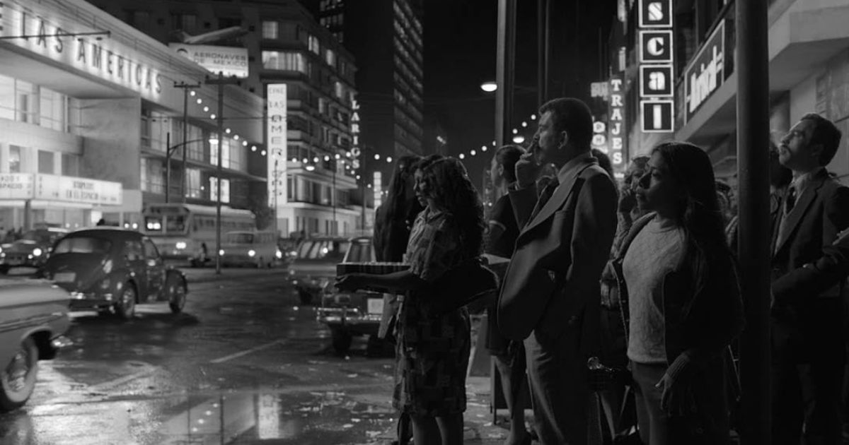 Una mujer cruza una calle bulliciosa de noche. Autos pasan ruidosamente. Un tranvía hace su recorrido. Detrás de ella vemos arbotantes parpadeantes, una marquesina de cine e imponentes anuncios de neón. Llovió temprano; el pavimento aún está mojado. Es la Ciudad de México a principios de la década de 1970.