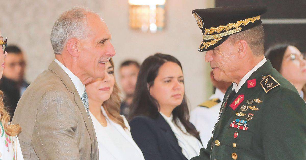 Informe. El presidente Nasry Asfura se saluda con el jefe de las Fuerzas Armadas, general de Brigada Héctor Benjamín Valerio, en el acto de presentación del Informe Anual 2025 del Conadeh sobre la situación actual de las libertades civiles y las garantías fundamentales en Honduras.