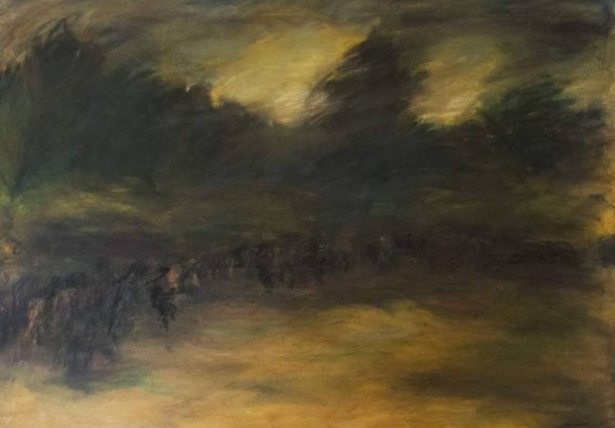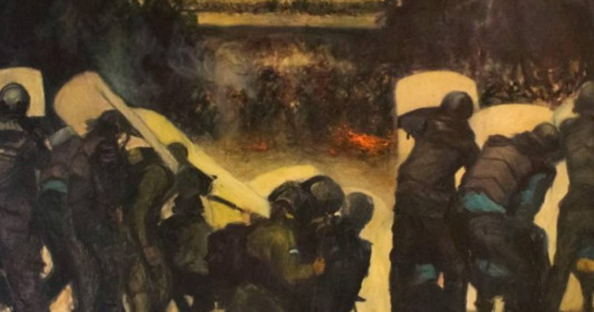 En la obra que lleva por título “Retirada”, la artista no esconde su denuncia social y literalmente toma partido ante la crisis política que vive el país, pero esta obra no seduce por la escena temática, sino por la calidad de los planos visuales resueltos magistralmente, por la cantidad de veladuras o transparencias, además, resuelve la perspectiva a puros contrastes de luz y no sobre líneas y punto de fuga, más que perspectiva, ese cuadro tiene profundidad.