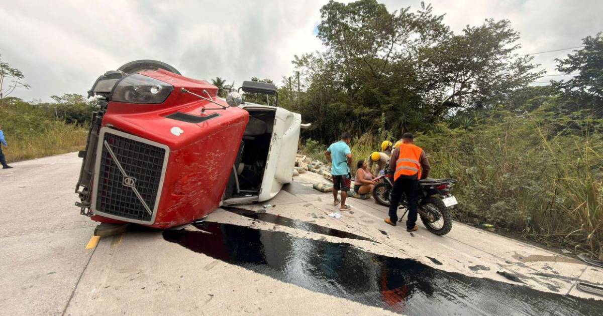 El pesado automotor quedó en la orilla de la carretera y el producto disperso en las cercanías del cabezal.