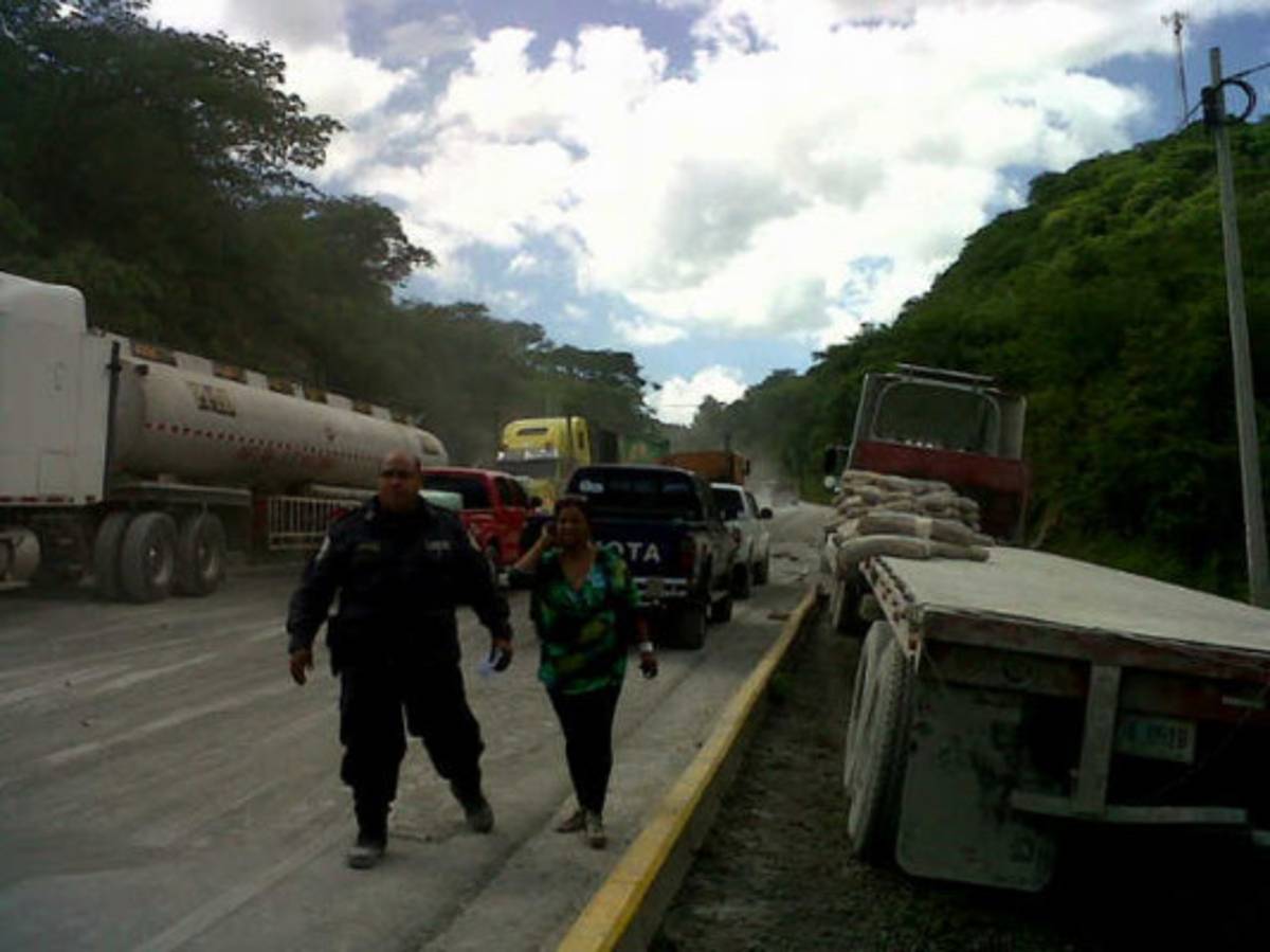 En una curva que está cerca del desvío a la aldea Cofradía, una rastra cargada de cemento circulaba en sentido contrario y debido al exceso de velocidad la carga se cayó de la carrocería y varias bolsas impactaron en la parte frontal de la unidad de transporte de pasajeros.