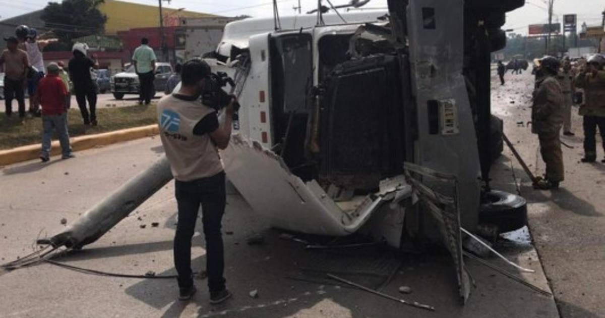 Imágenes captadas a través de las cámaras de seguridad muestran cómo el conductor de la rastra, identificado como Osman Omar Bueso Mejía, impacta contra un poste del tendido eléctrico, salta la mediana y vuelca en el carril contrario. Todo ocurrió en Siguatepeque, Comayagua, zona central de Honduras.