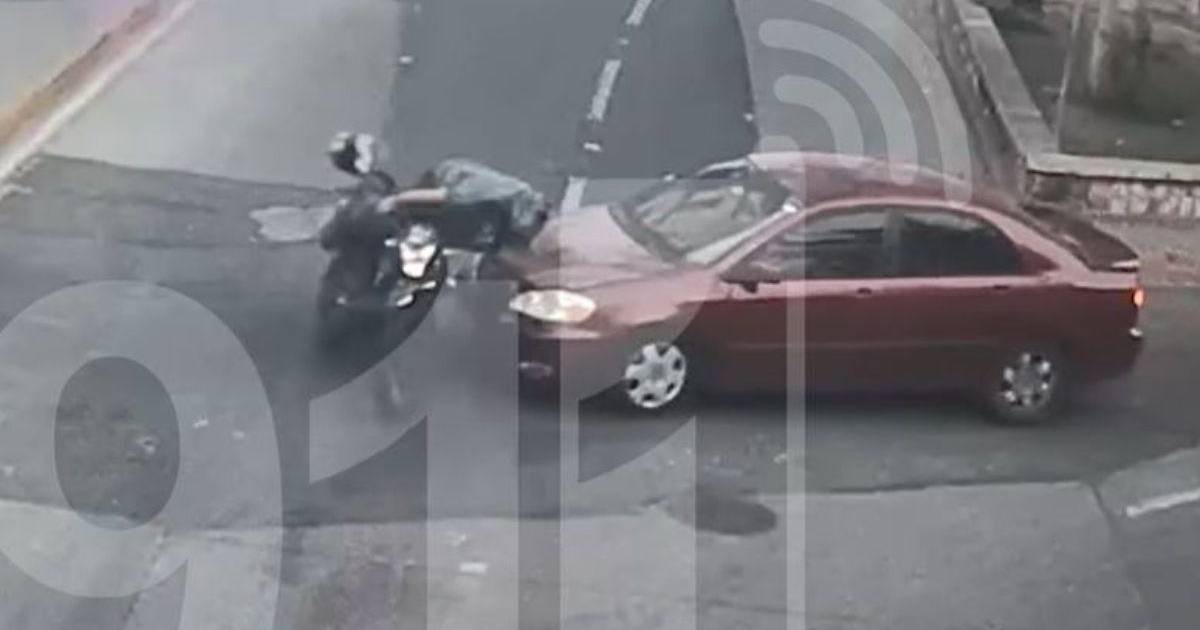 En las imágenes se puede apreciar el momento en que el conductor del vehículo de dos ruedas conduce despacio por su carril, hasta que su trayecto se vio interrumpido de forma abrupta por un automóvil, tipo turismo, que lo interceptó al momento de intentar pasar a la siguiente calle en el concurrido sector.