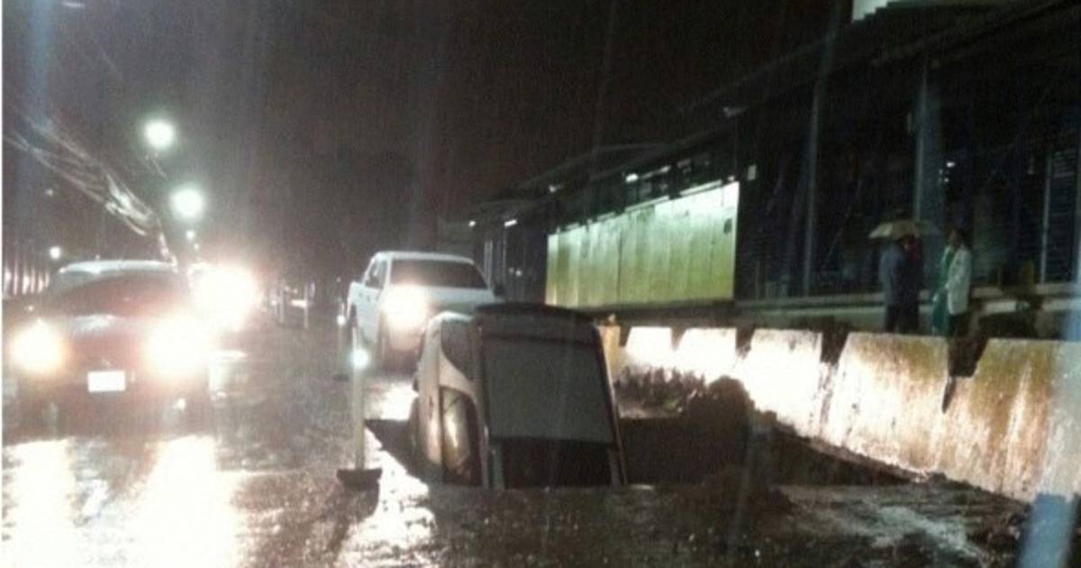 Las fuertes lluvias más la falta de señalizaciones en la zona de construccón ubicada frente al proyecto Trans 450 provocó que el conductor del automotor se fuera al agujero.