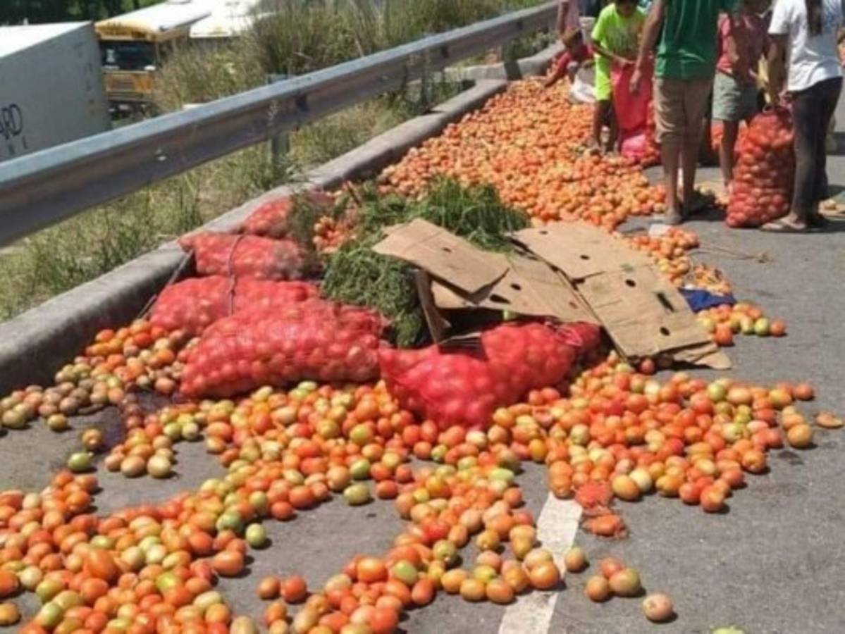 El carro tipo pick up, color gris y con placas HBA-3510, trasladaba varios sacos de tomates en su parte trasera, los cuales quedaron esparcidos por toda la vía luego del terrible volcamiento.