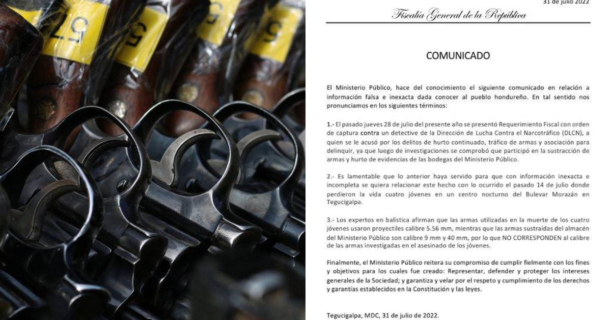 TEGUCIGALPA, HONDURAS.- El Ministerio Público descartó este domingo que las armas sustraídas por un agente de la Dirección de Lucha Contra el Narcotráfico (DLCN), delito por el que se encuentra bajo detención, sean las utilizadas en la masacre donde murieron cuatro jóvenes, entre ellos Saíd Lobo.