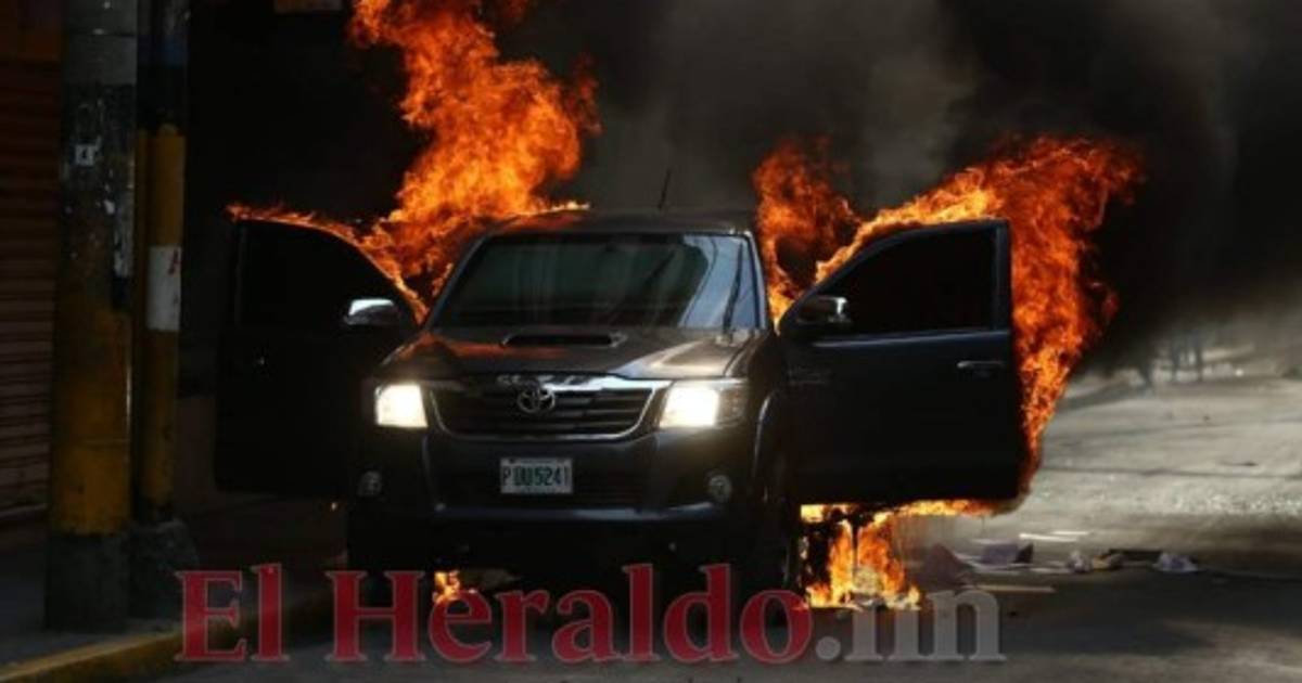 El automotor blindado, tipo pick-up, doble cabina, color gris, fue prendido en llamas en el centro de la capital hondureña, exactamente frente a las instalaciones de Hondutel.