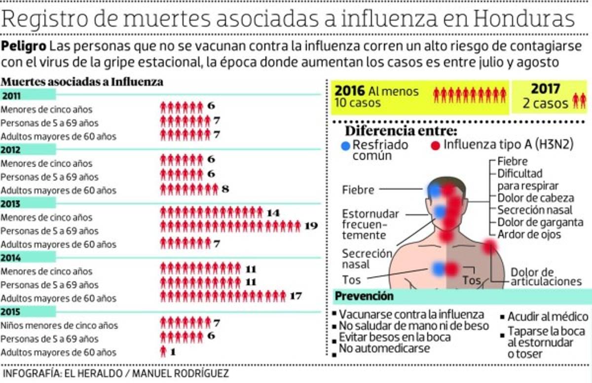Desde 2011 hasta la fecha han fallecido más de 130 personas a causa de la gripe estacional. La principal medida de prevención que pueden tomar las personas es vacunarse contra la influenza en los centros de salud. Ida Molina, jefa del Programa Ampliado de Inmunización (PAI), manifestó que se vacunó a 816,558 personas y la meta establecida era 988,473, es decir se alcanzó el 83%. Pese a que la Campaña Nacional de Vacunación ya finalizó, se determinó continuar aplicando la vacuna en los centros de salud del país. El coordinador nacional de la Vigilancia de Influenza y otros virus respiratorios de Salud, Homer Mejía, expresó que el primer caso mortal por influenza en el año fue un bebé de 11 meses de nacido. Salud reporta más de 20 casos confirmados de influenza por laboratorio.