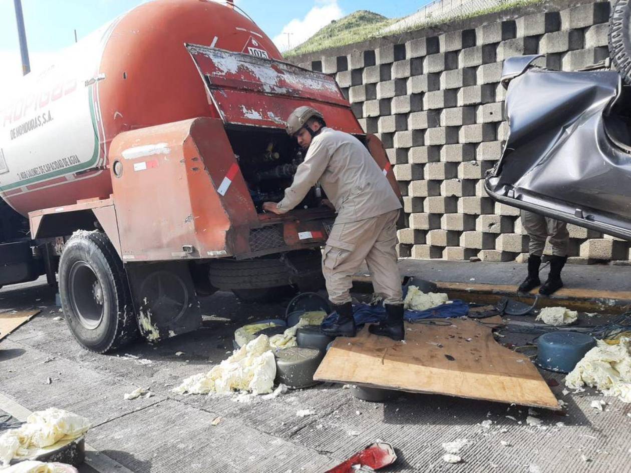 En el incidente estuvieron involucrados un pick-up, color gris, con placas HED 7086, que transportaba quesillo de la zona de Olancho, y un camión tanque de una empresa distribuidora de gas, cargada del explosivo material, con placas HCL 5791.