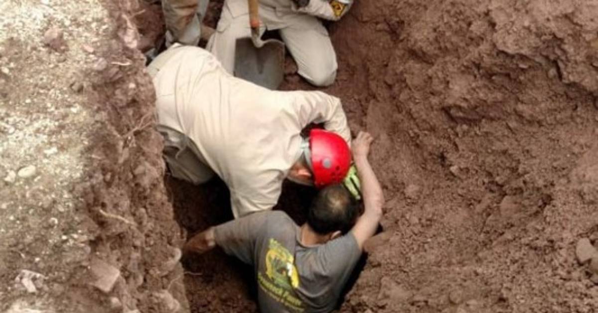 Mientras los Bomberos realizaban el rescate, otros hombres, que también laboran en la zona, se sumaron y colocaron palos para evitar que la tierra siguiera cayendo y dificultara las labores.