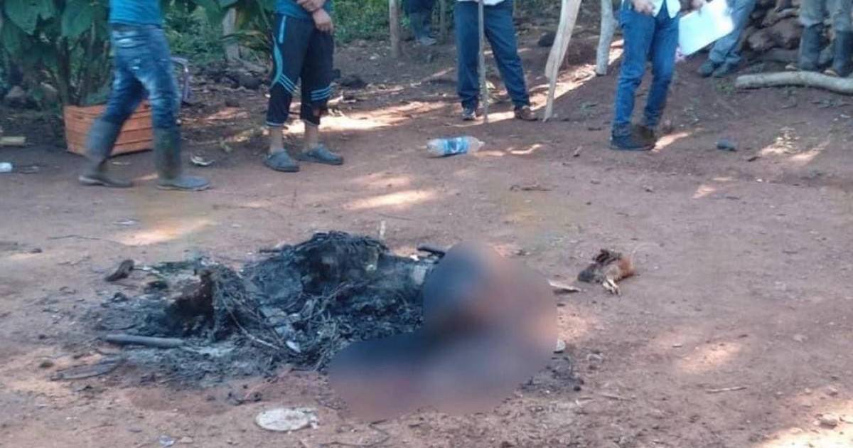 La mayor parte del cadáver de la víctima quedó totalmente calcinado en medio del patio de una casa de la aldea. Junto a los restos se podían observar varias armas blancas tipo machete que habrían sido utilizados para perpetrar el crimen.