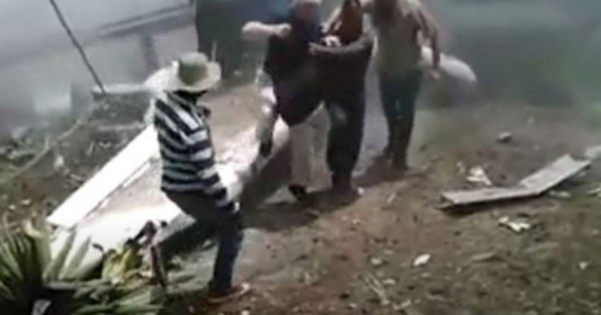 El hombre de edad madura y cabellera gris, vistiendo camisa negra y pantalón blanco, es auxiliado por un grupo de ciudadanos que se apresuraron a ayudar a los accidentados.
