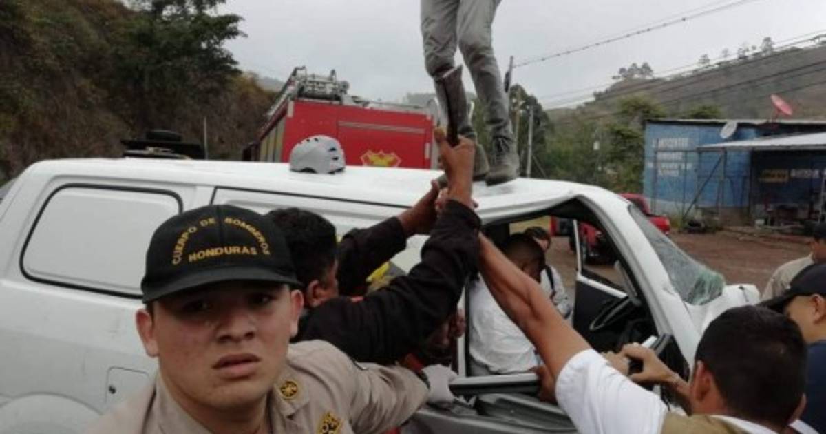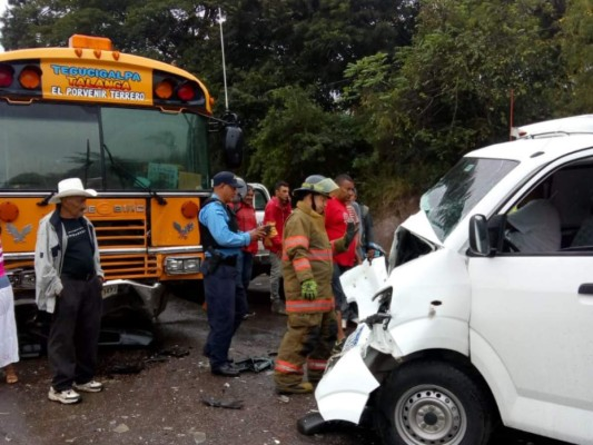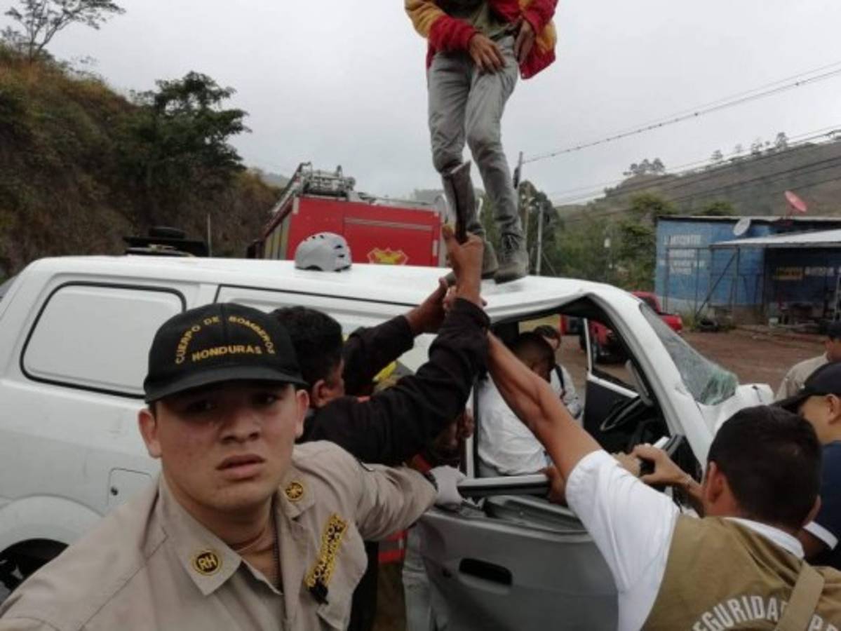 COMAYAGÜELA, HONDURAS.- Un hombre fue rescatado, por elementos del cuerpo de Bomberos, luego de quedar atrapado en un vehículo tras un accidente de tránsito entre un busito blanco y un bus amarillo, en la salida a la carretera a Olancho, en la capital.