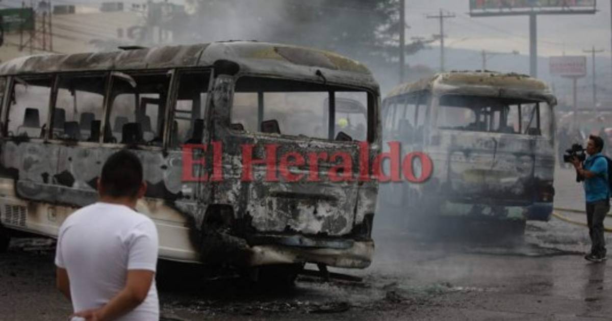 TEGUCIGALPA, HONDURAS.- Jóvenes que se encontraban frente a la Universidad Nacional Autónoma de Honduras captaron el momento en que encapuchados incendiaron las unidades de transporte que se quemaron en su totalidad.