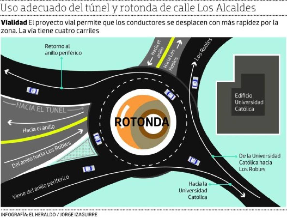 En el caso de los conductores que vienen desde el periférico y se dirigen a la universidad, deberán usar el carril derecho y si desean retornar deben usar la rotonda. Para seguir su camino hacia Comayagüela deben usar el carril del túnel.