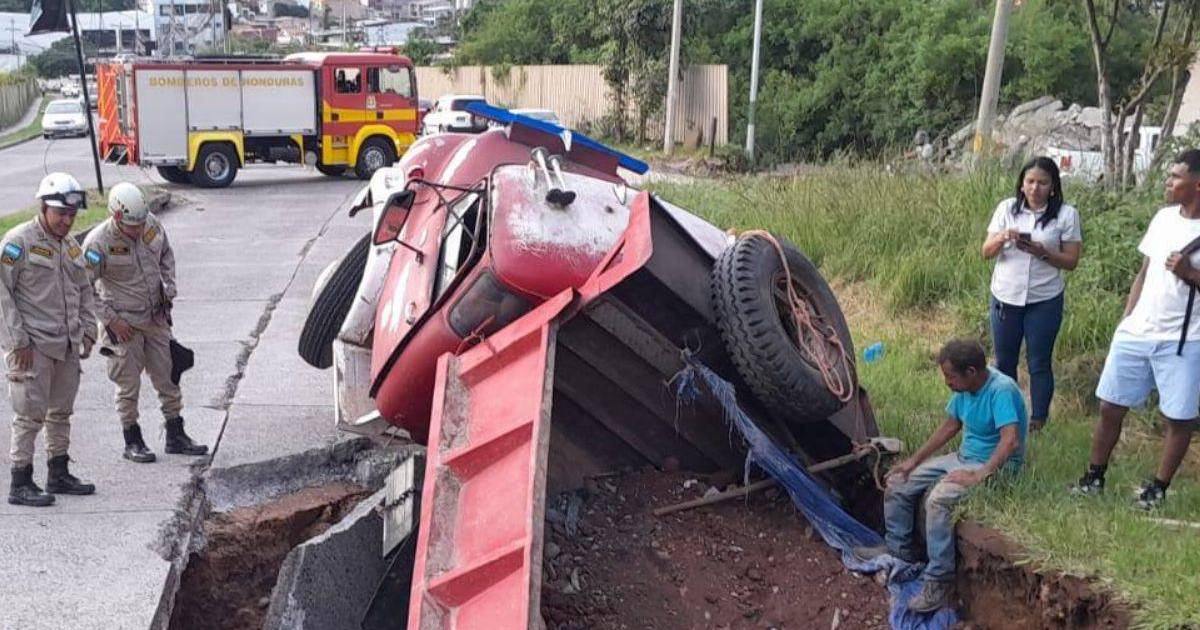 Tegucigalpa, Honduras.- Una volqueta cayó en un enorme socavón que se formó repentinamente en la residencial Venecia, ubicada después de la Universidad Tecnológica de Honduras (UTH), en Tegucigalpa, en la capital de Honduras.