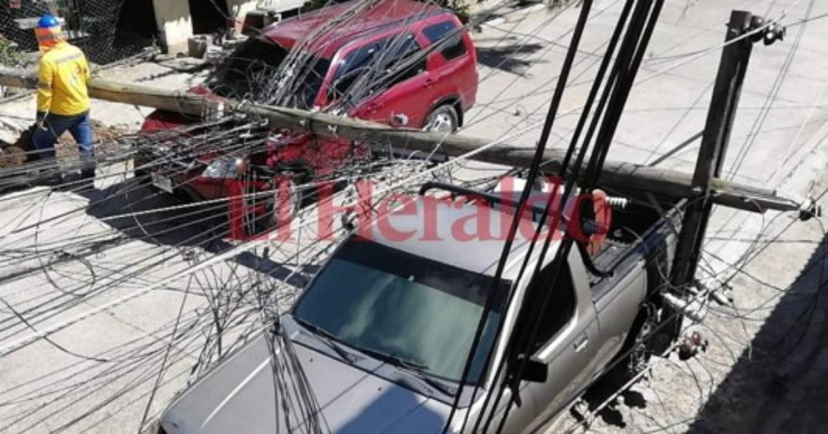 TEGUCIGALPA, HONDURAS.- Dos postes de energía eléctrica cayeron la mañana del miércoles sobre dos vehículos en el