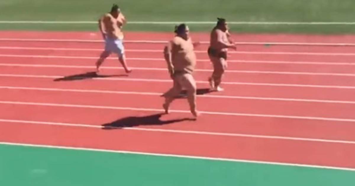 Tres luchadores de sumo japoneses, conocidos por su fuerza y peso corporal, prueban sobre el tartán sus facultades como velocistas en una carrera de 60 metros. Pese a la corta longitud, el 'sprint' ha sido todo un reto para los pesados atletas.
