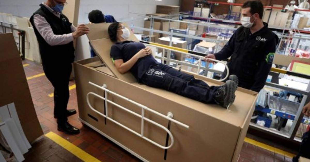ABC Displays ha creado una cama de cartón con barandilla metálica que según los diseñadores puede servirle de ataúd al paciente si fallece.