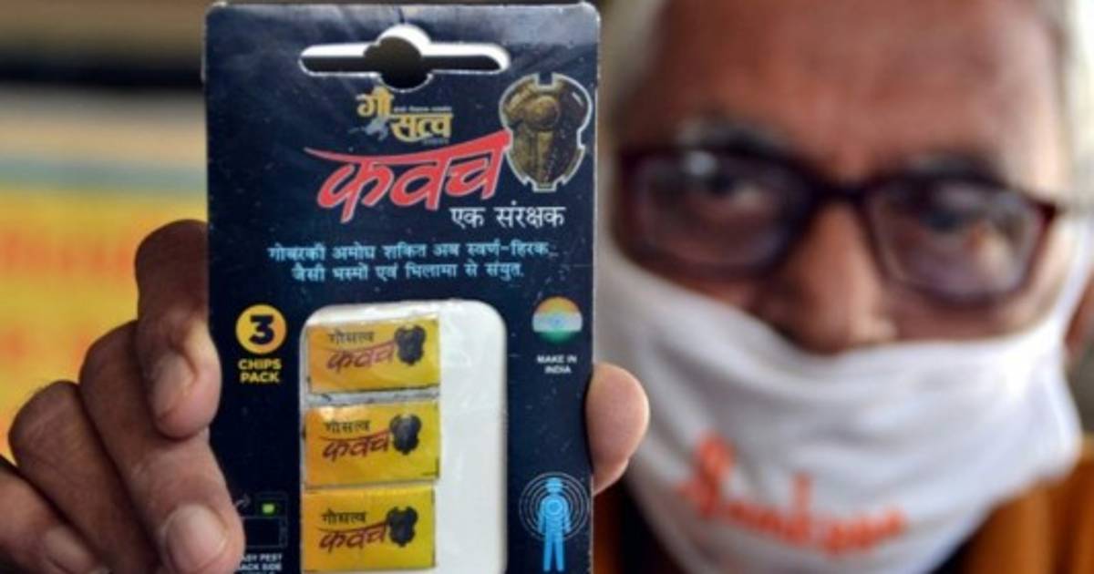 'Hemos observado que si se coloca este chip en el móvil, reduce significativamente la radiación', afirmó Vallabhbhai Kathiria, mostrando una fina placa amarilla del tamaño de una tarjeta SIM.