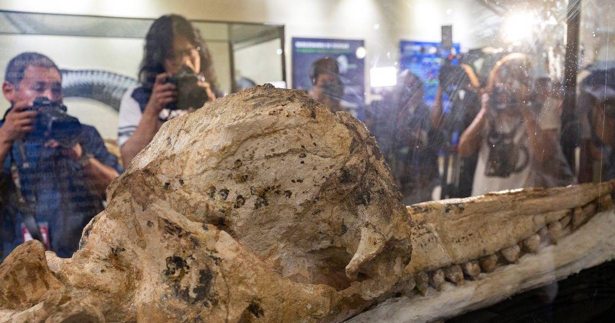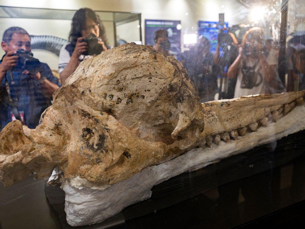 LIMA, PERÚ.- Un fósil de cráneo con mandíbulas de un nuevo cachalote prehistórico fue hallado en Perú “preservado intacto por siete millones de años” y constituye el mejor de su tipo, según los científicos que presentaron el descubrimiento este miércoles en Lima.