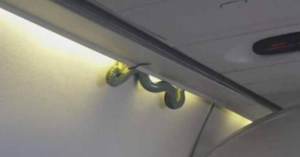 Un video breve muestra a una serpiente de tonos verdes que sale del techo por detrás de los portaequipajes y luego se queda colgando de ese lugar.