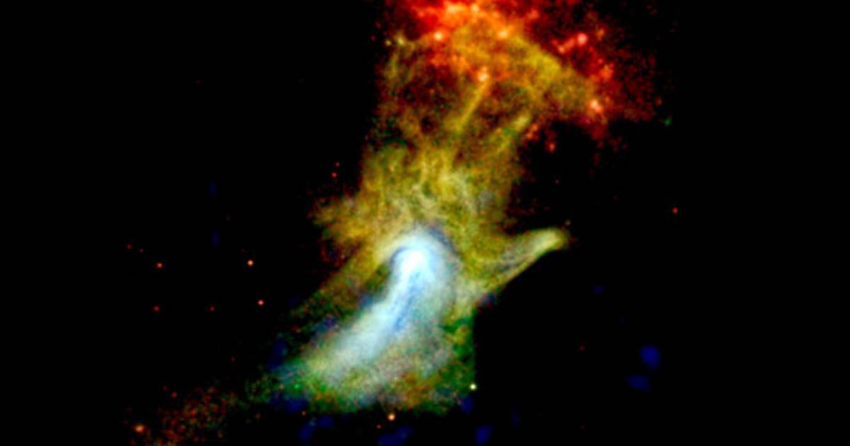 La 'Mano de Dios' sería producto de la explosión de una estrella en una supernova y la posterior expulsión de una enorme nube de materia cósmica, visible en la zona azul de la imagen, explicó la agencia espacial estadounidense.