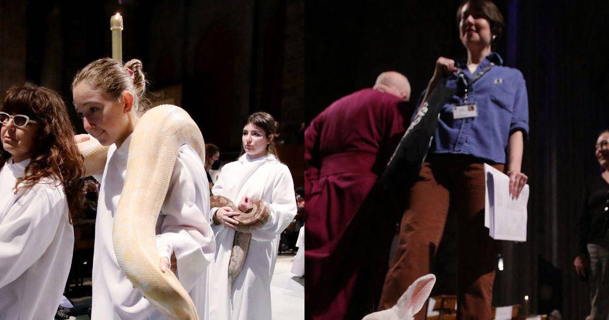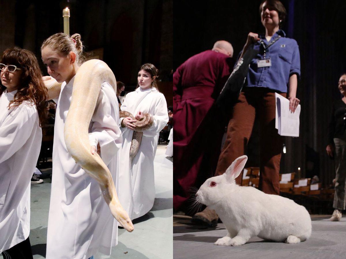 La selección de animales -entre ellos el joven camello, que vive en una finca del estado de Nueva York-, el búho, las serpientes -una pitón amarilla que tuvieron que cargar dos personas-, el caimán, una joven avestruz o unos ponis miniatura, - cargados por voluntarios que tuvieron la suerte de ser bendecidos por el propio obispo, uno por uno, aguardaron en sus jaulas y sus cajas en el exterior de la catedral hasta que llegó su turno. .